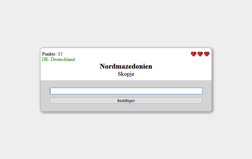 • Zeitspiel - Das Zeitspiel funktioniert wie "4 Flaggen", nur gibt es diesmal eine Zeitliche begrenzung. Durch richtiges Antworten wird diese vergößert. Falsche Antworten kosten Zeit.