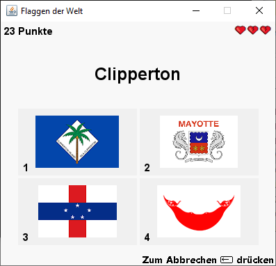 • 4 Flaggen - Es wird der Name des Landes, Staates oder der Sonderregion vorgegeben sowie vier Flaggen als Antwortmöglichkleit